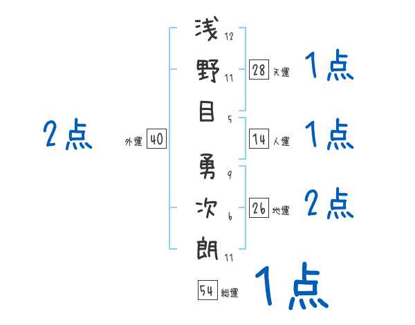 天運![]() | 浅野目勇次朗さんの天運は28画の1つ星!家庭環境に注意。スポーツで活躍できる能力があるかも。 家系が持つ宿命的な運勢を表します。祖先から受け継いだ苗字ですので自分の力が及びません。家柄を象徴します。 |