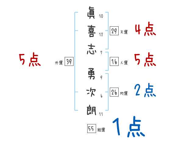 天運![]() | 眞喜志勇次朗さんの天運は29画の4つ星!完全主義で才能がある。厳格な心の持ち主。 家系が持つ宿命的な運勢を表します。祖先から受け継いだ苗字ですので自分の力が及びません。家柄を象徴します。 |