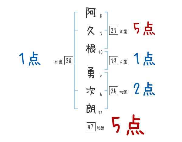 総運![]() | 阿久根勇次朗さんの総運は47画の5つ星!実力が開花し発展する円満な人生。財に恵まれる。 あなたの人生を表す1番重要な運勢です。生涯を通じて影響する総合運となり、主に50歳以降の晩年期に影響を及ぼします。 |