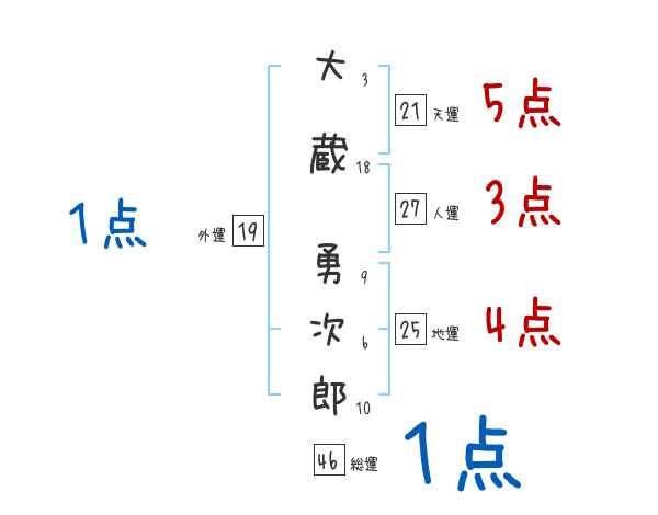天運![]() | 大蔵勇次郎さんの天運は21画の5つ星!統率力がある。独立し成功する。名誉を手に入れる。 家系が持つ宿命的な運勢を表します。祖先から受け継いだ苗字ですので自分の力が及びません。家柄を象徴します。 |