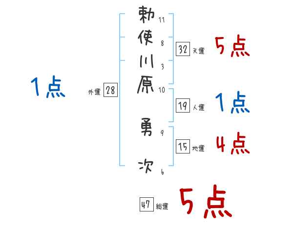 天運![]() | 勅使川原勇次さんの天運は32画の5つ星!柔軟性があり成功する。チャンスが多く金運が良い。 家系が持つ宿命的な運勢を表します。祖先から受け継いだ苗字ですので自分の力が及びません。家柄を象徴します。 |