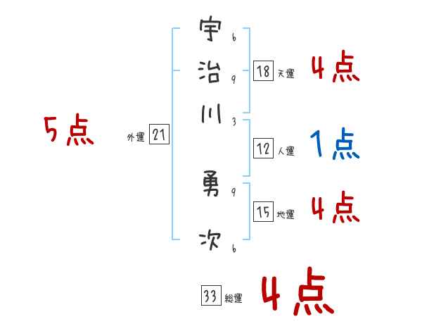 天運![]() | 宇治川勇次さんの天運は18画の4つ星!情熱的で剛気。忍耐力があり信頼される。 家系が持つ宿命的な運勢を表します。祖先から受け継いだ苗字ですので自分の力が及びません。家柄を象徴します。 |