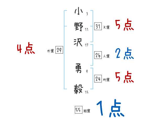 総運![]() | 小野沢勇毅さんの総運は55画の1つ星!欲張りな性格で軽率な行動に注意しましょう。病気に気をつけて。 あなたの人生を表す1番重要な運勢です。生涯を通じて影響する総合運となり、主に50歳以降の晩年期に影響を及ぼします。 |