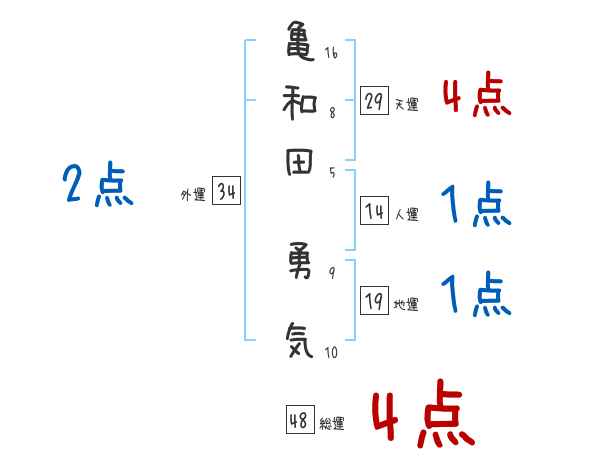 総運![]() | 亀和田勇気さんの総運は48画の4つ星!賢明な性格で人望が厚い。指導力があり多くの人に尊敬される。 あなたの人生を表す1番重要な運勢です。生涯を通じて影響する総合運となり、主に50歳以降の晩年期に影響を及ぼします。 |