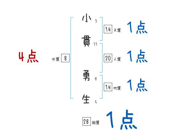 総運![]() | 小貫勇生さんの総運は28画の1つ星!家庭環境に注意。スポーツで活躍できる能力があるかも。 あなたの人生を表す1番重要な運勢です。生涯を通じて影響する総合運となり、主に50歳以降の晩年期に影響を及ぼします。 |