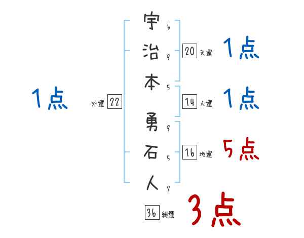 総運![]() | 宇治本勇石人さんの総運は36画の3つ星!先見性が豊かです。多少神経質で苦労することも。 あなたの人生を表す1番重要な運勢です。生涯を通じて影響する総合運となり、主に50歳以降の晩年期に影響を及ぼします。 |