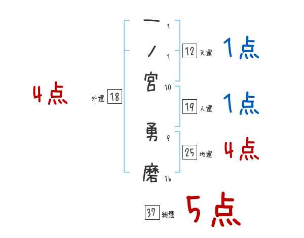 外運![]() | 一ノ宮勇磨さんの外運は18画の4つ星!情熱的で剛気。忍耐力があり信頼される。 生活面を象徴する運勢です。外部から受ける影響力を表し、結婚運、家庭運や職場、環境への順応性を表します。 |