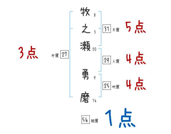 総運![]() | 牧之瀬勇磨さんの総運は56画の1つ星!消極的で無気力になりがち。誠実な気持ちが必要でしょう。 あなたの人生を表す1番重要な運勢です。生涯を通じて影響する総合運となり、主に50歳以降の晩年期に影響を及ぼします。 |