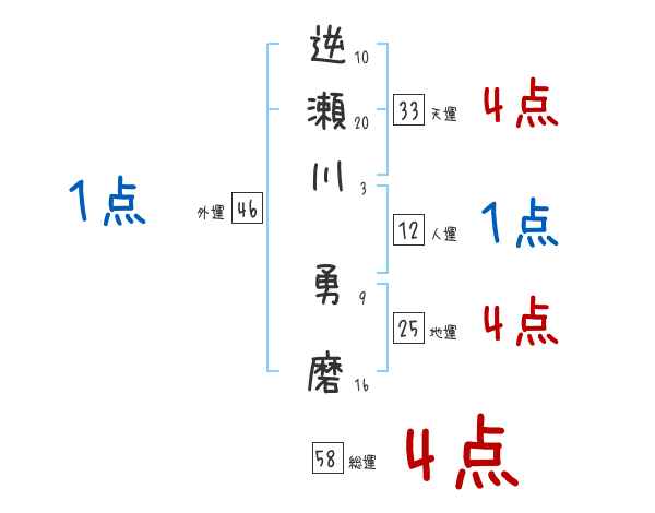 外運![]() | 逆瀬川勇磨さんの外運は46画の1つ星!迷走することが多く苦労するかも。目先のことにとらわれないように。 生活面を象徴する運勢です。外部から受ける影響力を表し、結婚運、家庭運や職場、環境への順応性を表します。 |