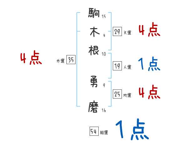 外運![]() | 駒木根勇磨さんの外運は35画の4つ星!温厚な性格で感受性が高い。穏和な性格で人望が厚い。 生活面を象徴する運勢です。外部から受ける影響力を表し、結婚運、家庭運や職場、環境への順応性を表します。 |