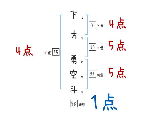 総運![]() | 下方勇空斗さんの総運は28画の1つ星!家庭環境に注意。スポーツで活躍できる能力があるかも。 あなたの人生を表す1番重要な運勢です。生涯を通じて影響する総合運となり、主に50歳以降の晩年期に影響を及ぼします。 |