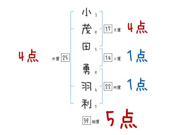 総運![]() | 小茂田勇羽利さんの総運は39画の5つ星!社交性に優れ人望が厚い。人の上に立ち成功する。 あなたの人生を表す1番重要な運勢です。生涯を通じて影響する総合運となり、主に50歳以降の晩年期に影響を及ぼします。 |