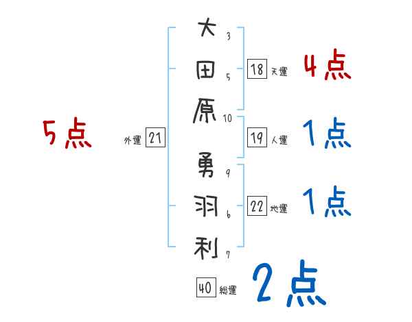 天運![]() | 大田原勇羽利さんの天運は18画の4つ星!情熱的で剛気。忍耐力があり信頼される。 家系が持つ宿命的な運勢を表します。祖先から受け継いだ苗字ですので自分の力が及びません。家柄を象徴します。 |