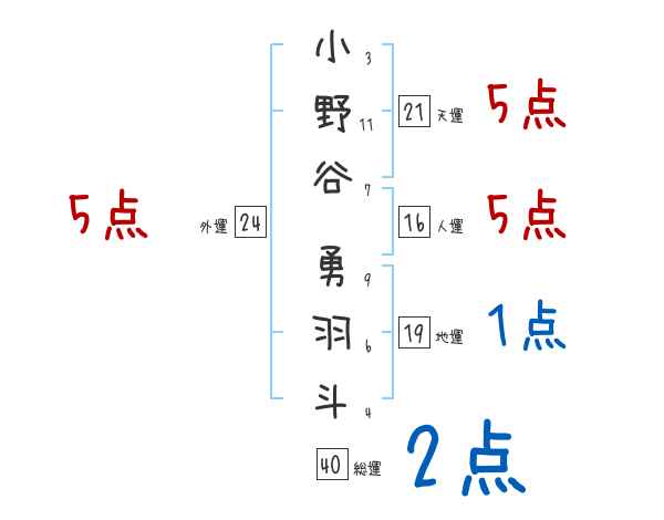 外運![]() | 小野谷勇羽斗さんの外運は24画の5つ星!家庭運が良く順調な人生。金運にも恵まれる。 生活面を象徴する運勢です。外部から受ける影響力を表し、結婚運、家庭運や職場、環境への順応性を表します。 |