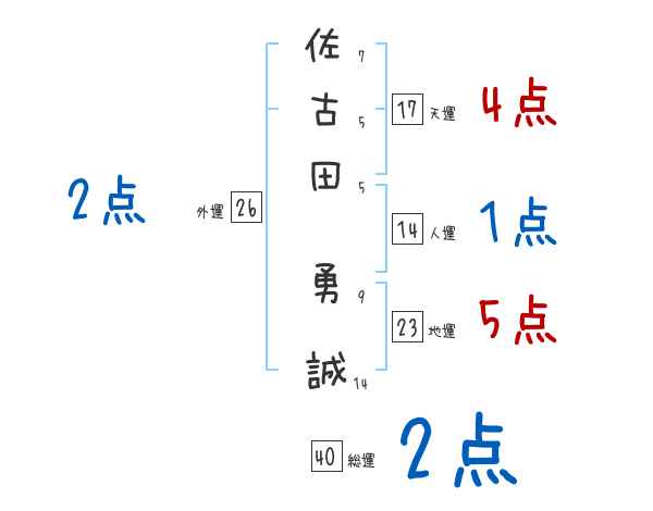 外運![]() | 佐古田勇誠さんの外運は26画の2つ星!波瀾万丈かも。信頼できる人を大事にしましょう。 生活面を象徴する運勢です。外部から受ける影響力を表し、結婚運、家庭運や職場、環境への順応性を表します。 |