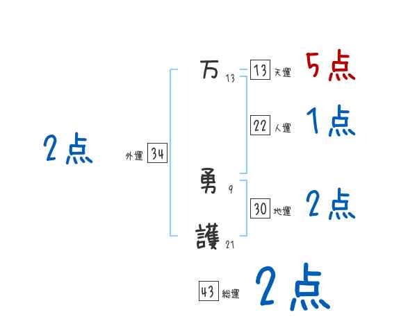 天運![]() | 万勇護さんの天運は13画の5つ星!才能に恵まれ人気がある。名声を手に入れる。円満な人生。 家系が持つ宿命的な運勢を表します。祖先から受け継いだ苗字ですので自分の力が及びません。家柄を象徴します。 |
