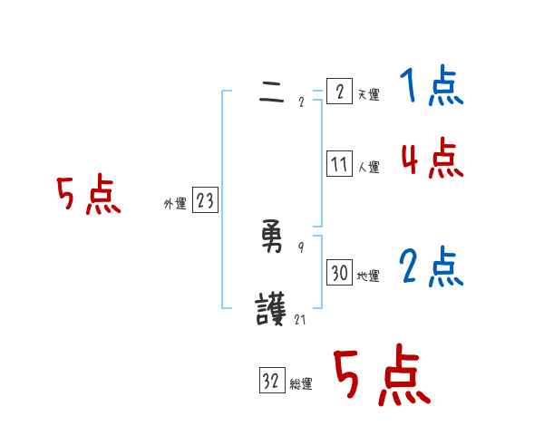 総運![]() | 二勇護さんの総運は32画の5つ星!柔軟性があり成功する。チャンスが多く金運が良い。 あなたの人生を表す1番重要な運勢です。生涯を通じて影響する総合運となり、主に50歳以降の晩年期に影響を及ぼします。 |