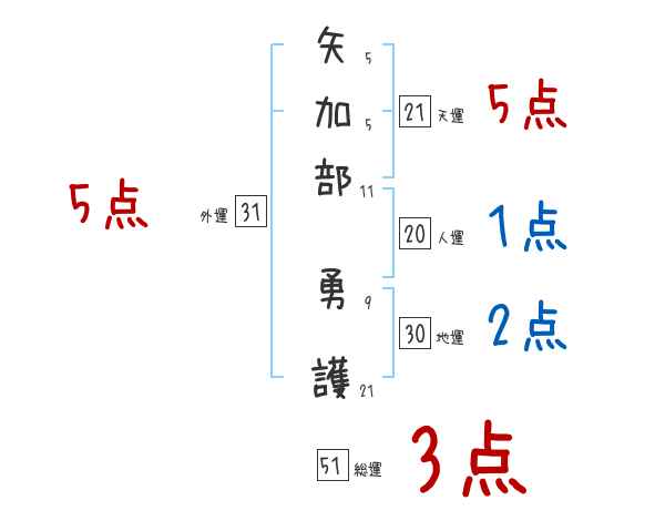 天運![]() | 矢加部勇護さんの天運は21画の5つ星!統率力がある。独立し成功する。名誉を手に入れる。 家系が持つ宿命的な運勢を表します。祖先から受け継いだ苗字ですので自分の力が及びません。家柄を象徴します。 |