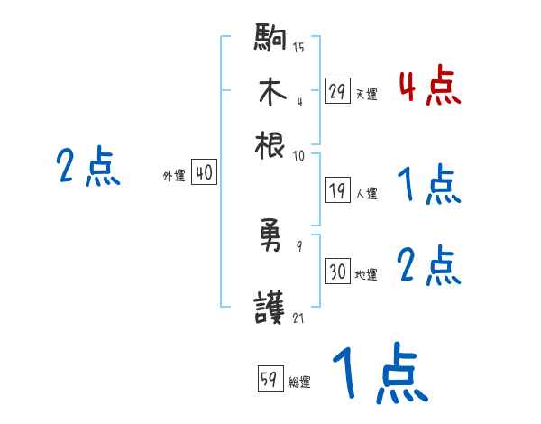 総運![]() | 駒木根勇護さんの総運は59画の1つ星!意志の弱さであきらめることが多いかも。粘り強さが必要。 あなたの人生を表す1番重要な運勢です。生涯を通じて影響する総合運となり、主に50歳以降の晩年期に影響を及ぼします。 |