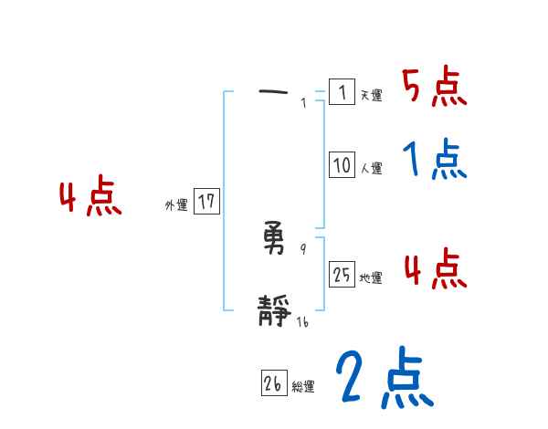 天運![]() | 一勇靜さんの天運は1画の5つ星!行動力、指導力があり出世し繁栄する。幸運に恵まれる。 家系が持つ宿命的な運勢を表します。祖先から受け継いだ苗字ですので自分の力が及びません。家柄を象徴します。 |