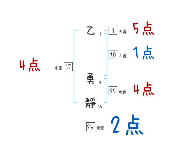 天運![]() | 乙勇靜さんの天運は1画の5つ星!行動力、指導力があり出世し繁栄する。幸運に恵まれる。 家系が持つ宿命的な運勢を表します。祖先から受け継いだ苗字ですので自分の力が及びません。家柄を象徴します。 |