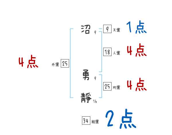 総運![]() | 沼勇靜さんの総運は34画の2つ星!独創性に優れるが、自尊心が強く災難に注意しましょう。 あなたの人生を表す1番重要な運勢です。生涯を通じて影響する総合運となり、主に50歳以降の晩年期に影響を及ぼします。 |