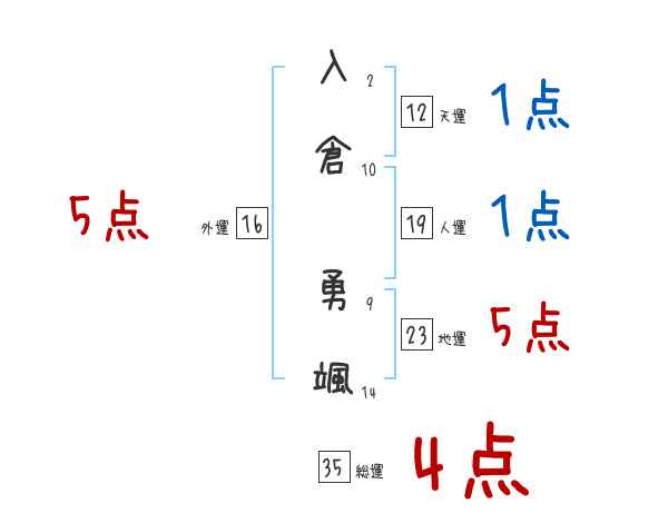 総運![]() | 入倉勇颯さんの総運は35画の4つ星!温厚な性格で感受性が高い。穏和な性格で人望が厚い。 あなたの人生を表す1番重要な運勢です。生涯を通じて影響する総合運となり、主に50歳以降の晩年期に影響を及ぼします。 |