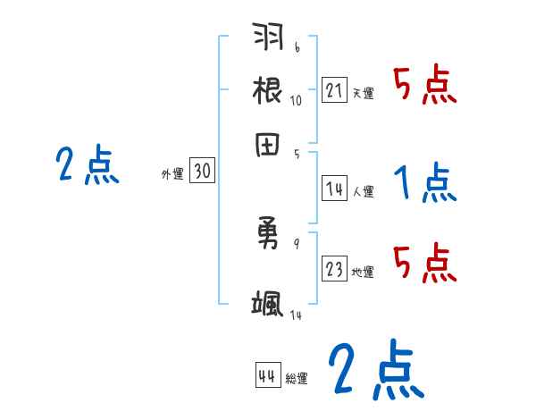天運![]() | 羽根田勇颯さんの天運は21画の5つ星!統率力がある。独立し成功する。名誉を手に入れる。 家系が持つ宿命的な運勢を表します。祖先から受け継いだ苗字ですので自分の力が及びません。家柄を象徴します。 |