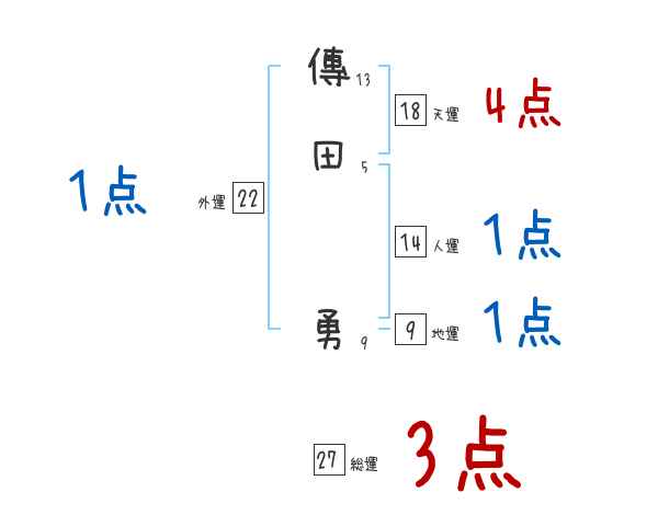 天運![]() | 傳田勇さんの天運は18画の4つ星!情熱的で剛気。忍耐力があり信頼される。 家系が持つ宿命的な運勢を表します。祖先から受け継いだ苗字ですので自分の力が及びません。家柄を象徴します。 |