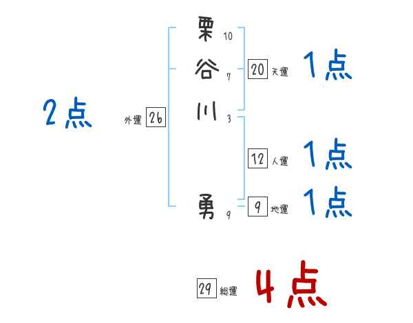 総運![]() | 栗谷川勇さんの総運は29画の4つ星!完全主義で才能がある。厳格な心の持ち主。 あなたの人生を表す1番重要な運勢です。生涯を通じて影響する総合運となり、主に50歳以降の晩年期に影響を及ぼします。 |