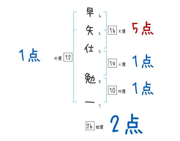 天運![]() | 早矢仕勉一さんの天運は16画の5つ星!人望が厚く大きく発展する。逆転成功が見える。 家系が持つ宿命的な運勢を表します。祖先から受け継いだ苗字ですので自分の力が及びません。家柄を象徴します。 |