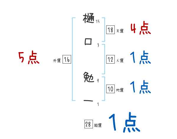 総運![]() | 樋口勉一さんの総運は28画の1つ星!家庭環境に注意。スポーツで活躍できる能力があるかも。 あなたの人生を表す1番重要な運勢です。生涯を通じて影響する総合運となり、主に50歳以降の晩年期に影響を及ぼします。 |