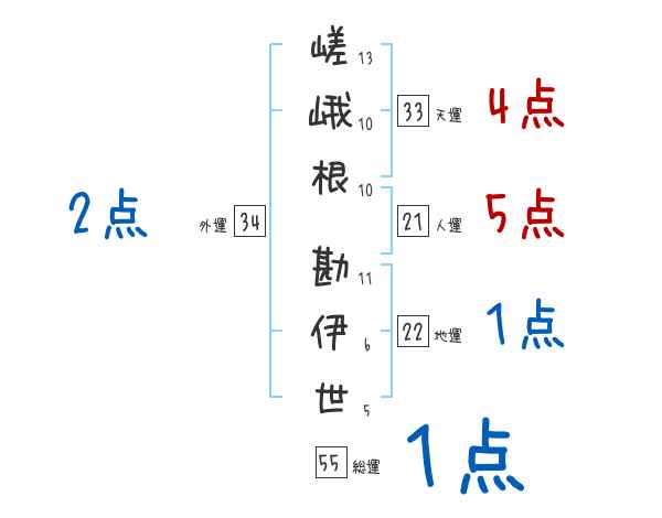 天運![]() | 嵯峨根勘伊世さんの天運は33画の4つ星!権力志向でプライドが高い。勇気があり運を切り開き成功する。 家系が持つ宿命的な運勢を表します。祖先から受け継いだ苗字ですので自分の力が及びません。家柄を象徴します。 |