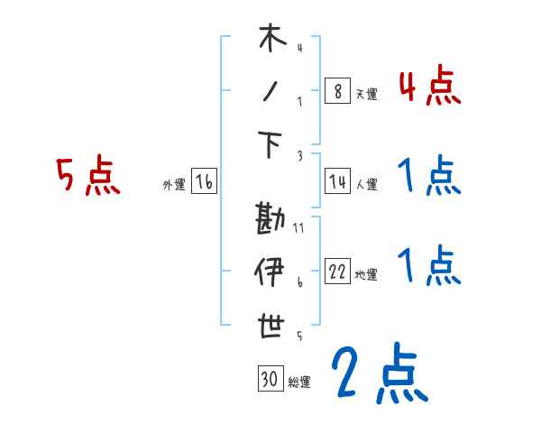 天運![]() | 木ノ下勘伊世さんの天運は8画の4つ星!勤勉家。根気強く努力し成功する。忍耐力がある。 家系が持つ宿命的な運勢を表します。祖先から受け継いだ苗字ですので自分の力が及びません。家柄を象徴します。 |