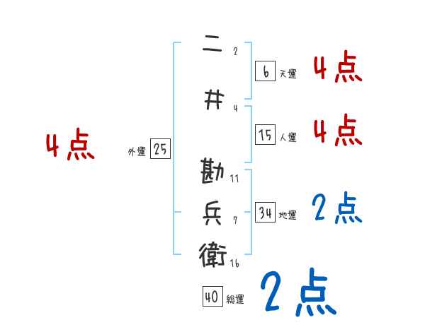 天運![]() | 二井勘兵衛さんの天運は6画の4つ星!慎重な努力家で信頼を得る。誠実な精神で向上心に優れる。 家系が持つ宿命的な運勢を表します。祖先から受け継いだ苗字ですので自分の力が及びません。家柄を象徴します。 |