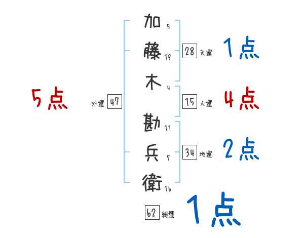 外運![]() | 加藤木勘兵衛さんの外運は47画の5つ星!実力が開花し発展する円満な人生。財に恵まれる。 生活面を象徴する運勢です。外部から受ける影響力を表し、結婚運、家庭運や職場、環境への順応性を表します。 |