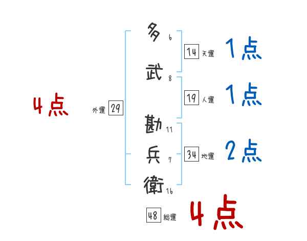 天運![]() | 多武勘兵衛さんの天運は14画の1つ星!人に対して優しいがストレスを溜め込みがち。人間関係のトラブルを避けるよう気をつけましょう。 家系が持つ宿命的な運勢を表します。祖先から受け継いだ苗字ですので自分の力が及びません。家柄を象徴します。 |