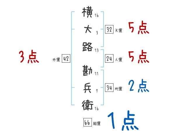 天運![]() | 横大路勘兵衛さんの天運は32画の5つ星!柔軟性があり成功する。チャンスが多く金運が良い。 家系が持つ宿命的な運勢を表します。祖先から受け継いだ苗字ですので自分の力が及びません。家柄を象徴します。 |