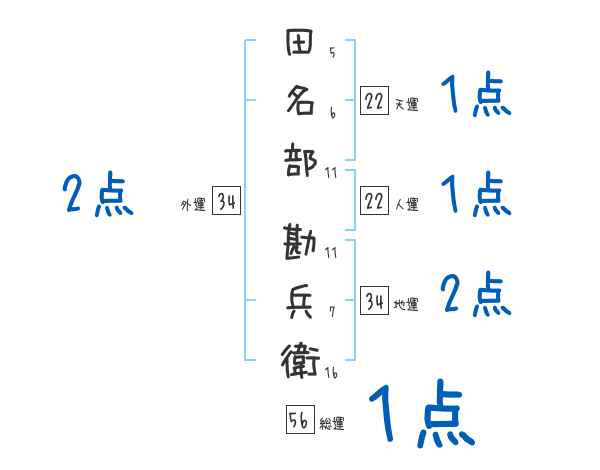 天運![]() | 田名部勘兵衛さんの天運は22画の1つ星!努力することが苦手ないっぽう手先が器用。芸術性にも優れる。 家系が持つ宿命的な運勢を表します。祖先から受け継いだ苗字ですので自分の力が及びません。家柄を象徴します。 |