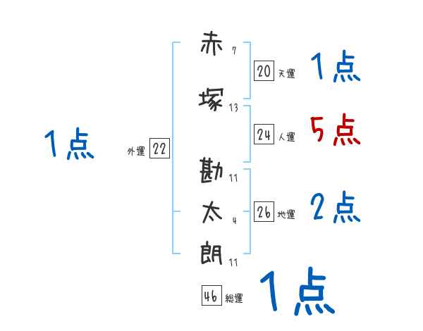 外運![]() | 赤塚勘太朗さんの外運は22画の1つ星!努力することが苦手ないっぽう手先が器用。芸術性にも優れる。 生活面を象徴する運勢です。外部から受ける影響力を表し、結婚運、家庭運や職場、環境への順応性を表します。 |