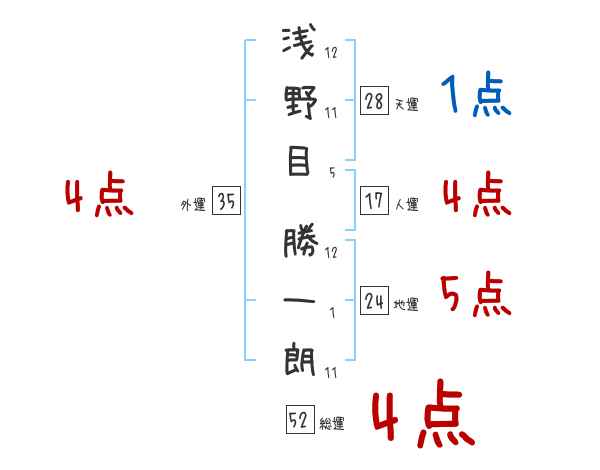 外運![]() | 浅野目勝一朗さんの外運は35画の4つ星!温厚な性格で感受性が高い。穏和な性格で人望が厚い。 生活面を象徴する運勢です。外部から受ける影響力を表し、結婚運、家庭運や職場、環境への順応性を表します。 |