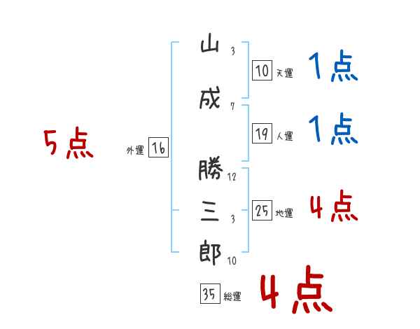 外運![]() | 山成勝三郎さんの外運は16画の5つ星!人望が厚く大きく発展する。逆転成功が見える。 生活面を象徴する運勢です。外部から受ける影響力を表し、結婚運、家庭運や職場、環境への順応性を表します。 |
