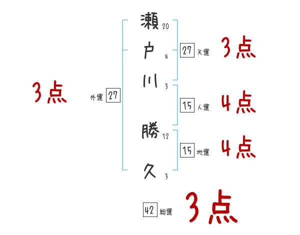 地運![]() | 瀬戸川勝久さんの地運は15画の4つ星!人徳があり出世する。順調に物事を進め円満な人生。 個性を表す基礎的な運勢です。性格形成や対人関係、行動力など家庭環境に影響されます。主に誕生してから20歳くらいまでの若年期の運勢を表します。 |