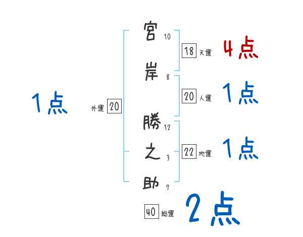 天運![]() | 宮岸勝之助さんの天運は18画の4つ星!情熱的で剛気。忍耐力があり信頼される。 家系が持つ宿命的な運勢を表します。祖先から受け継いだ苗字ですので自分の力が及びません。家柄を象徴します。 |