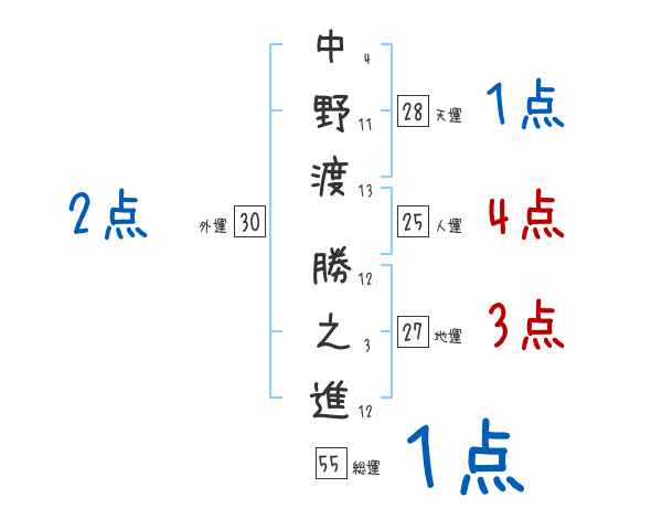 天運![]() | 中野渡勝之進さんの天運は28画の1つ星!家庭環境に注意。スポーツで活躍できる能力があるかも。 家系が持つ宿命的な運勢を表します。祖先から受け継いだ苗字ですので自分の力が及びません。家柄を象徴します。 |