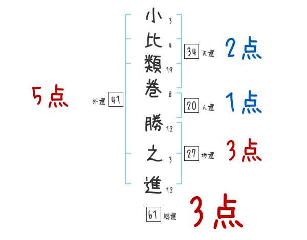 地運![]() | 小比類巻勝之進さんの地運は27画の3つ星!頭脳明晰だが強情で摩擦が多い傾向。孤立に注意。 個性を表す基礎的な運勢です。性格形成や対人関係、行動力など家庭環境に影響されます。主に誕生してから20歳くらいまでの若年期の運勢を表します。 |