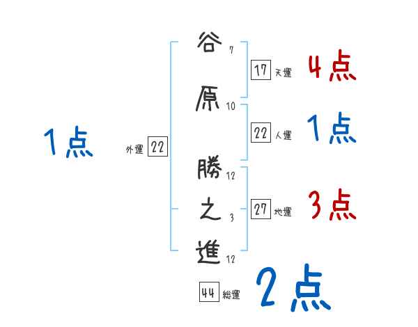 天運![]() | 谷原勝之進さんの天運は17画の4つ星!積極的な行動力。地位を気づき財産を手に入れる。純粋な心と直感力。 家系が持つ宿命的な運勢を表します。祖先から受け継いだ苗字ですので自分の力が及びません。家柄を象徴します。 |