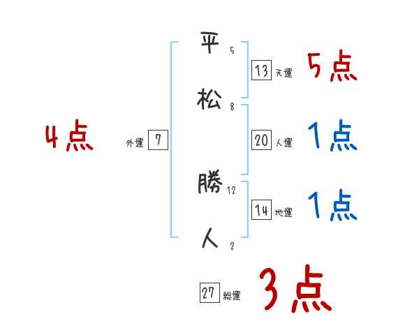 外運![]() | 平松勝人さんの外運は7画の4つ星!強い意志や信念を持ち独立心が強い。自立する。 生活面を象徴する運勢です。外部から受ける影響力を表し、結婚運、家庭運や職場、環境への順応性を表します。 |