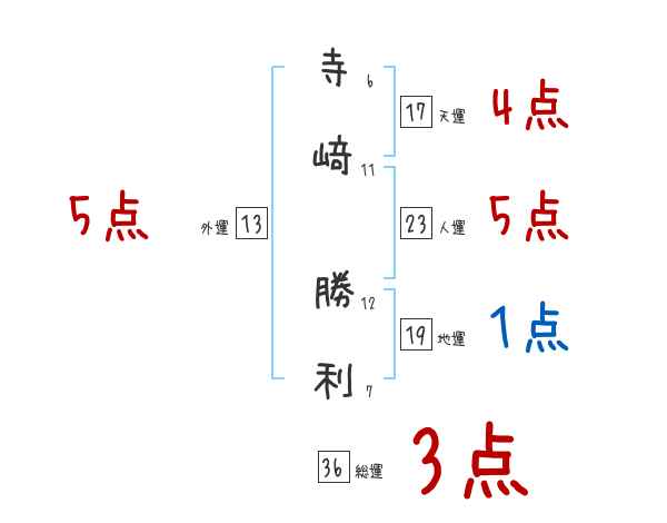 天運![]() | 寺﨑勝利さんの天運は17画の4つ星!積極的な行動力。地位を気づき財産を手に入れる。純粋な心と直感力。 家系が持つ宿命的な運勢を表します。祖先から受け継いだ苗字ですので自分の力が及びません。家柄を象徴します。 |