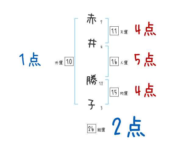 天運![]() | 赤井勝子さんの天運は11画の4つ星!着実に富や地位を得る幸運な人生。 家系が持つ宿命的な運勢を表します。祖先から受け継いだ苗字ですので自分の力が及びません。家柄を象徴します。 |